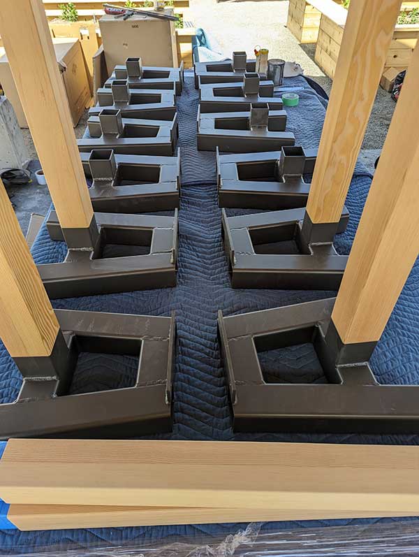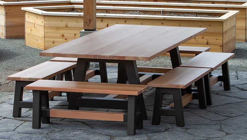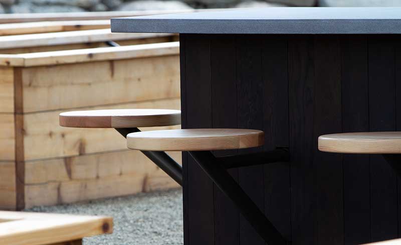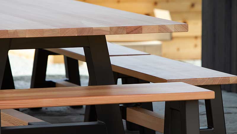 We opted to use Douglas fir for the table top, benches and seating. This was complemented with aluminum frames. All these material choices were important as this furniture would be living outside and we wanted to ensure that it could withstand the elements.