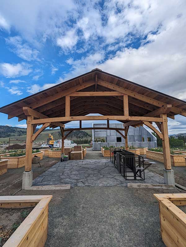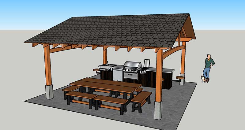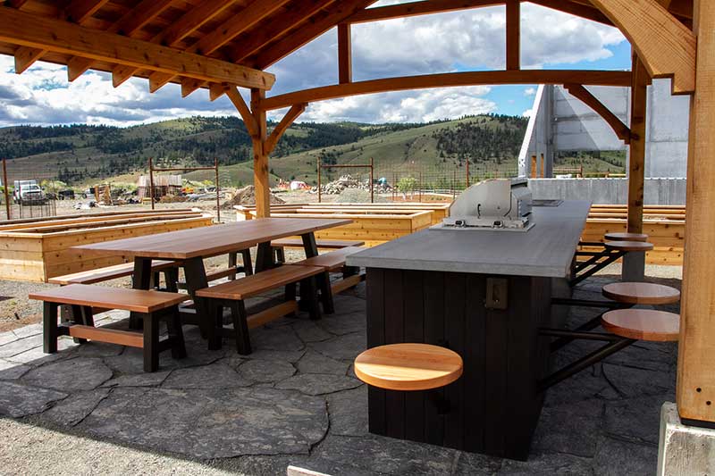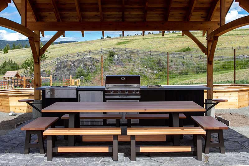This outdoor kitchen and dining set was co-designed with Jodi Plowe from Jodi Interior Design. She had some clients with an idea for an outdoor kitchen on their regenerative agriculture farm. They wanted to build an outdoor area where they could gather and share the fruits of their labour under a beautiful timber framed pavilion.