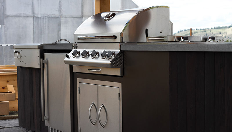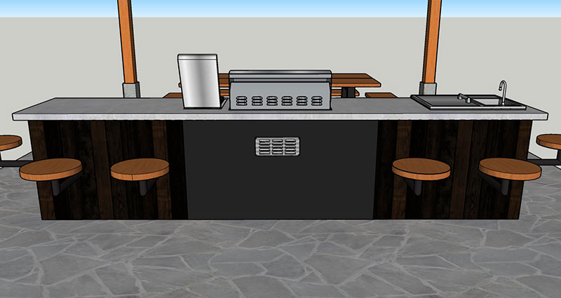 We opted to build stools into the frame of the kitchen itself because it would be set on rough and uneven flagstone ground. We didn’t want individual stools sitting on the uneven ground. The entire kitchen was built as one unit in an aluminum frame. It was designed and built around several Jackson Grill appliances including a BBQ, a double side burner, refrigerator, storage drawers and a cocktail sink. All the essential appliances needed for an outdoor kitchen. Any cladding on the kitchen that didn’t need to be fire resistant was made from Douglas Fir as well, however we burnt and combed it, which is an ancient eastern finishing technique called Sho – Sugi – Ban. In the design process we had to take water, drain and propane rough – ins into account. The kitchen was finished off with a thick concrete top from True Concrete Designs. All the woodwork was finished with an industry leading outdoor polyurethane finish for extra durability. All the aluminum was finished with a powder coated finish.
